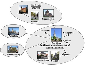 So gehörten zum Pfarrbereich Bad Kösen von 2001 bis 2018 neben der Kösener Kirchengemeinde (Bad Kösen, Fränkenau, Kukulau und Schulpforte) noch die Kirchspiele Saaleck-Kleinheringen und Möllern sowie die beiden Kirchengemeinden Punschrau und Hassenhausen.