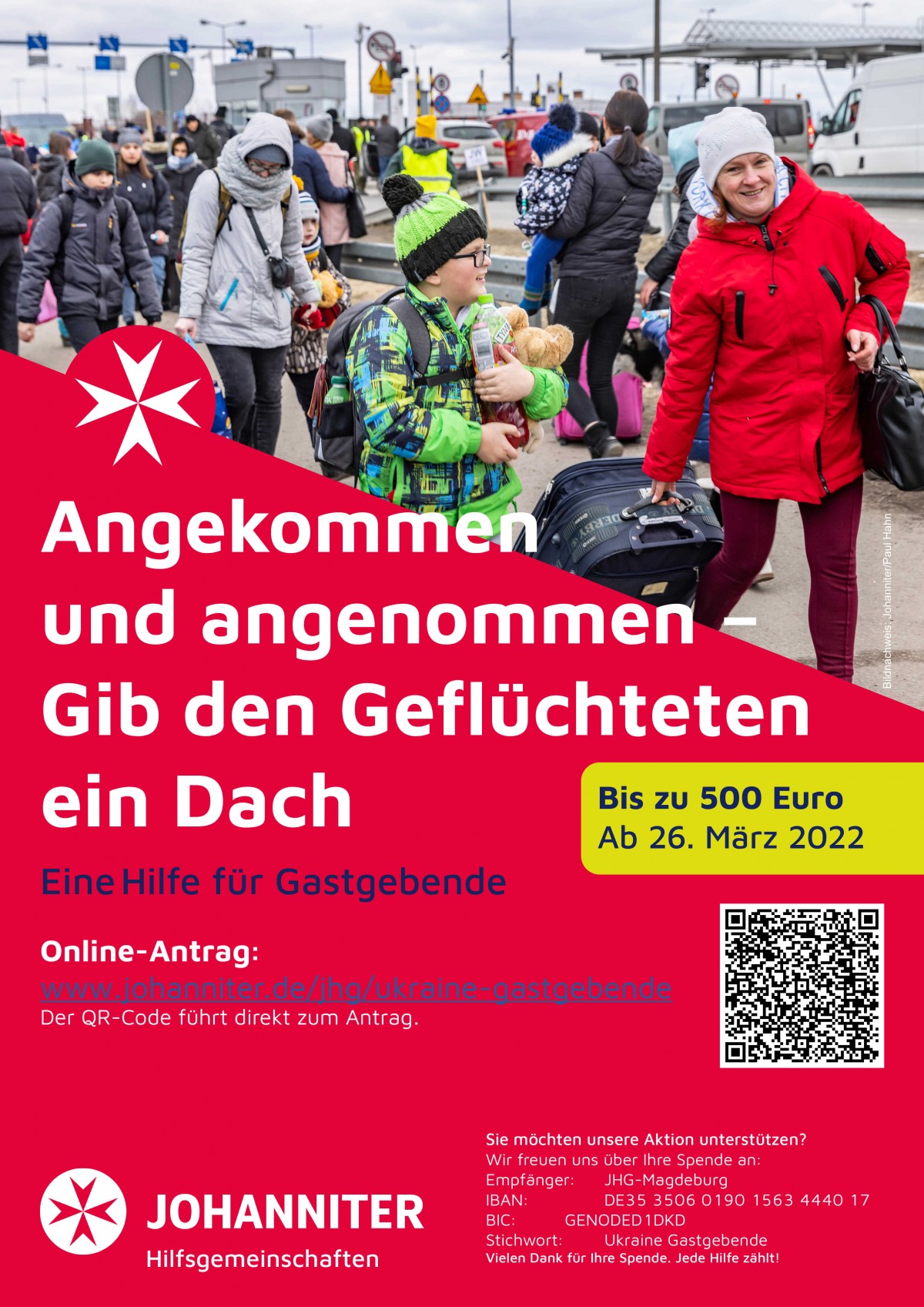 Dafür stellt der Johanniterorden zunächst 50 000 € bereit. Gastgebende können auf Antrag bis zu 500 € ausgezahlt bekommen. „Für Geflüchtete gibt es über die Landkreise und Kommunen Unterstützung aus öffentlicher Hand. Wir wollen – ganz im johanniterlichen Sinn - das private Engagement für die Bedürftigen stärken.“, so Bartmer. Die Johanniter Hilfsgemeinschaft ist ein Ordenswerk des Johanniterordens, das sich im Sinne christlicher Nächstenliebe um hilfsbedürftige Menschen kümmert. In der aktuellen Situation mit weiter zu erwartenden Geflüchteten komme es darauf an, dass sich möglichst viele Menschen ehrenamtlich einbringen.