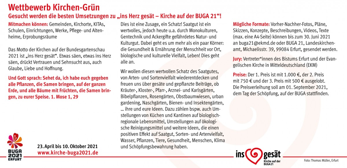 Der Wettbewerb „Kirchen-Grün“ wurde im Rahmen der Buga ausgelobt. Am 1. September zum Ökumenischen Tag der Schöpfung werden die Sieger durch unseren Landesbischof Friedrich Kramer und den Bischof des Bistums Erfurt Ulrich Neymeyer prämiert.