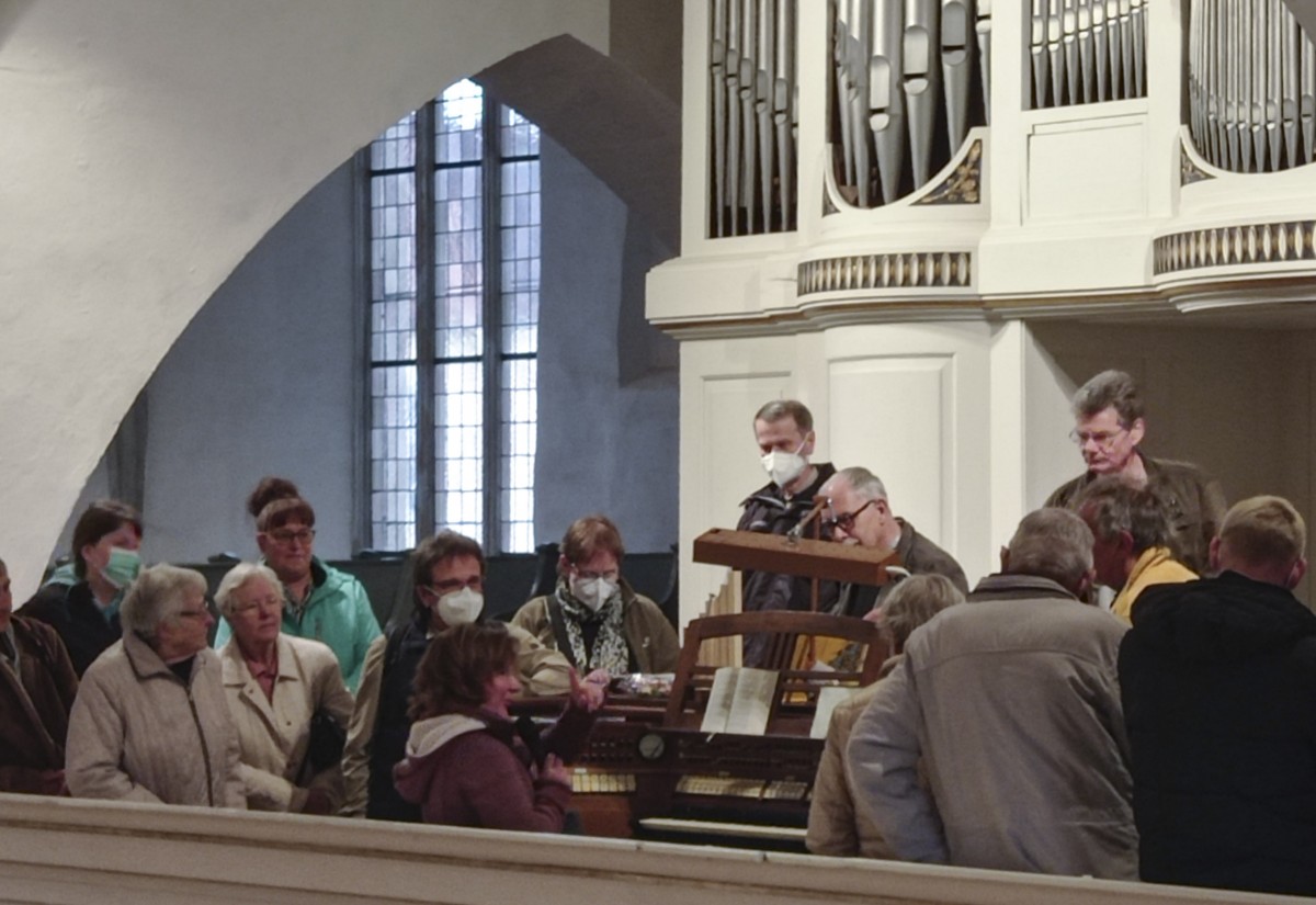 Nach kurzer Einführung am Modell und Erklärungen zum Funktionsprinzip einer Orgel, wollten die Gäste die besprochenen Pfeifen aller Art auch am Instrument selber betrachten. So wurde es schnell eng um die Kirchenmusikerin Johanna Schulze am Spieltisch der Orgel und sie durfte nun alle Register ziehen, um die Klangvielfalt des großen Instrumentes zu demonstrieren.
